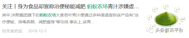 去年12月,包头市食品药品监督管理局和自贡市食品药品监督管理局也通过微信公众号转发了这篇题为《身为食品却宣称治便秘能减肥,蚂蚁农场青汁涉嫌虚假宣传》的报道。