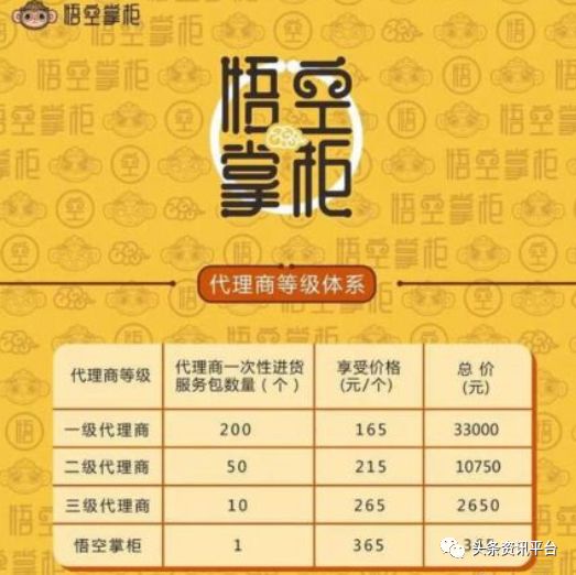 据了解,当时其代理级别分为五种:第一种,悟空掌柜:交纳365元,购买一个服务包(虚构产品)就可以做悟空掌柜;第二种,三级代理商:交纳2650元,购买十个服务包,就可以升级为三级代理商;第三种,二级代理商:交纳10750元,购买50个服务包,就可以升级为二级代理商;第四种,一级代理商:交纳33000元,购买200个服务包,就可以升级为一级代理商;第五种,全球合伙人,需要交纳13万元,购买1000个服务包才可完成升级。