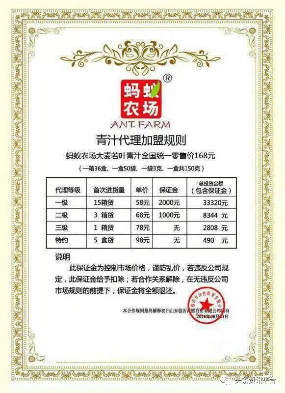 最后,我们来具体了解一下蚂蚁农场的青汁该如何代理。据代理小李介绍,“青汁最低拿五盒就可以直接代理,五盒以后可以一件代发,也可以累积升级,累积越多,价格越便宜”。