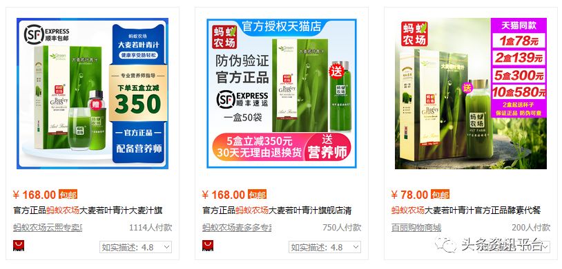 说完了悟空掌柜,我们再来看看号称中国青汁行业第一品牌的蚂蚁农场。