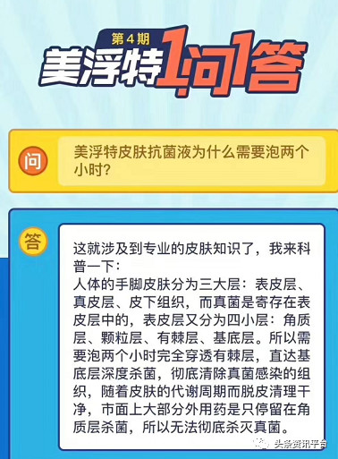 在众多有关宣传材料中,美浮特牌皮肤抗菌液都被宣传称具有治疗脚气、脚痒、脚臭、糜烂、脱皮、水泡、跖疣等诸多功效。而事实上,这只是一款消毒产品,不具备治疗功效。