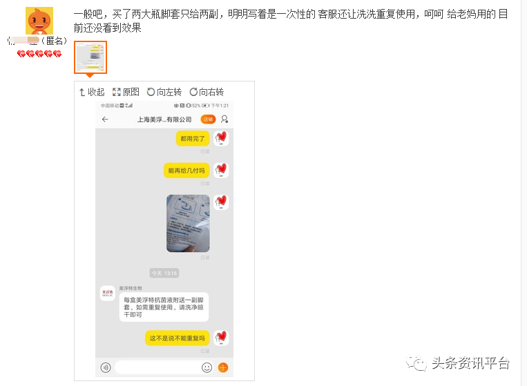 而在美浮特的官方淘宝店上,我们在这款产品的评价中,还看到了有用户反映脚套的问题:“明明写着是一次性的,客服还让洗洗重复使用”。