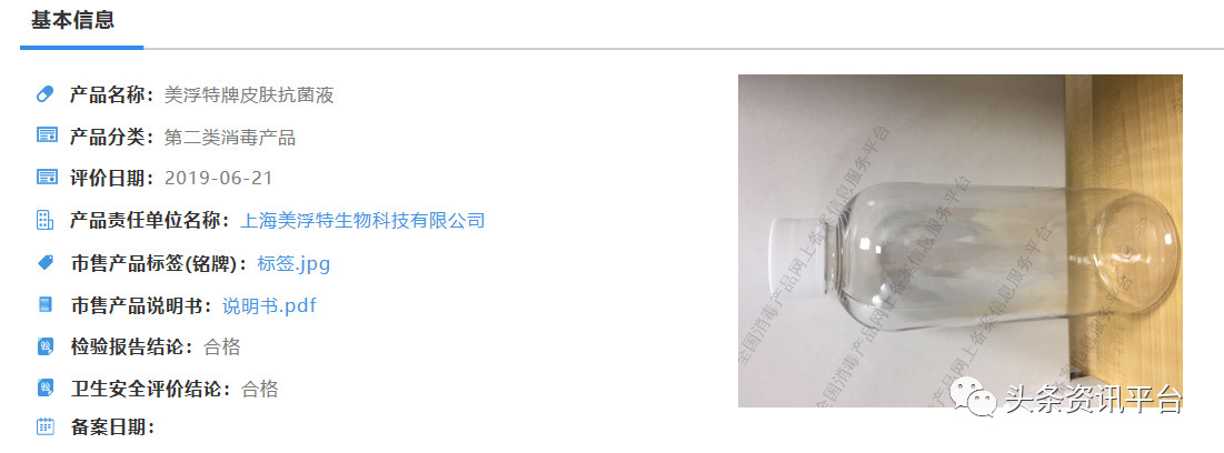据全国消毒产品网上备案信息服务平台显示,美浮特牌皮肤抗菌液是一款消毒产品,也就是俗称的“消字号”,生产企业许可证号为“沪卫消证字(2018)第0024号”,产品责任单位是上海美浮特生物科技有限公司,生产企业是上海米浮实业有限责任公司,其产品使用范围为“皮肤抗菌(用后及时清洗)”。在备案的使用范围内,该产品并无任何治疗作用。