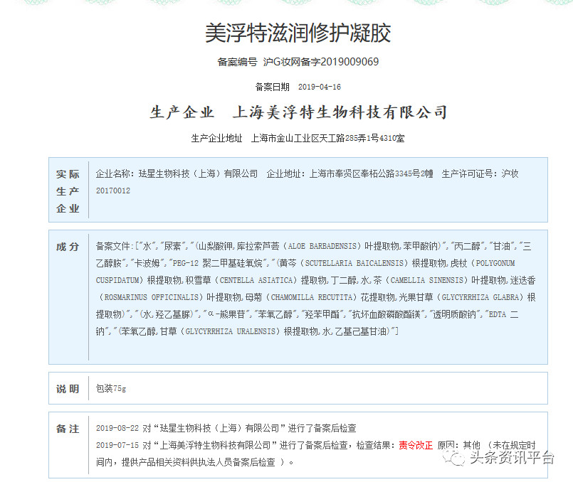 通过查询国家药监局非特备案信息平台,我们还发现美浮特旗下另一款备案编号为沪G妆网备字2019003441的产品——“美浮特滋润修护凝胶”已经注销,重新备案后的“美浮特滋润修护凝胶”的备案编号为沪G妆网备字2019009069,据该款产品的国产非特殊用途化妆品备案电子凭证下方的备注显示,今年7月15日,有关部门对其进行的备案后检查结果为“责令改正”,原因是未在规定时间内,提供产品相关资料供执法人员备案后检查。