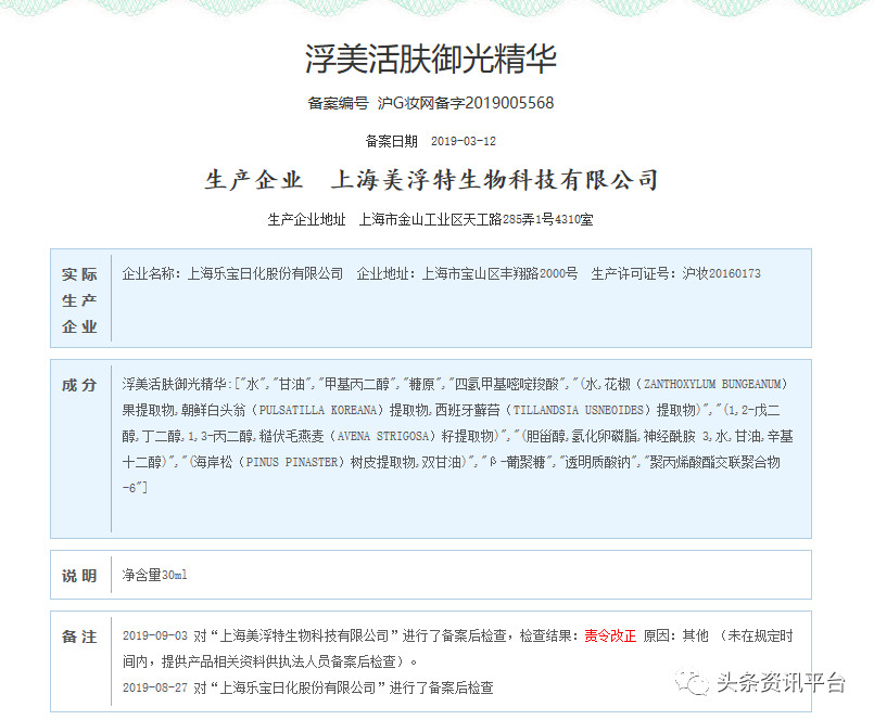 无独有偶,美浮特旗下的“浮美精粹修护乳”、“浮美VOMMY精粹焕颜修护面膜”、“浮美活肤御光精华”等产品,在今年9月3月,也一起遭到“责令改正”,原因和上述产品也是一模一样,均为未在规定时间内,提供产品相关资料供执法人员备案后检查。