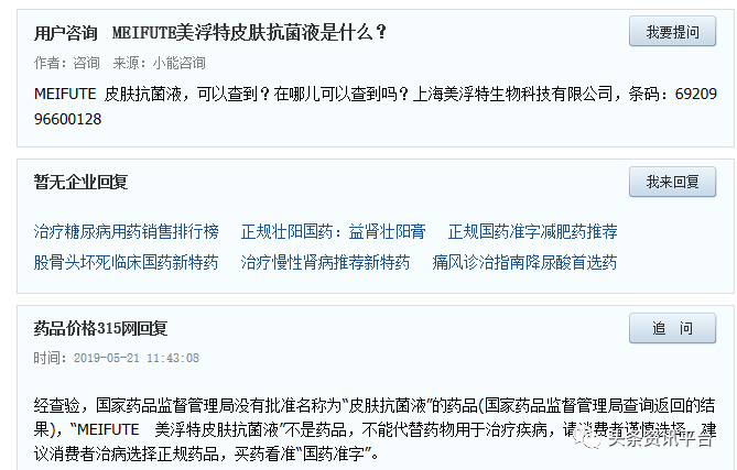 面对咨询“MEIFUTE美浮特皮肤抗菌液是什么?”时,“药品价格315”回复称,经查验,国家药品监督管理局没有批准名称为皮肤抗菌液的药品,美浮特皮肤抗菌液不是药品,不能代替药物用于治疗疾病,请消费者谨慎选择。建议消费者治病选择正规药品,买药看准国药准字。