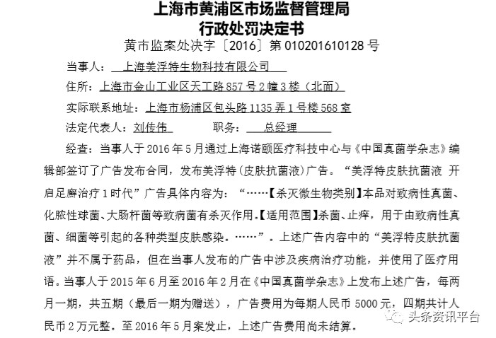 事实上,早在2016年8月16日,美浮特公司就因“在广告中涉及疾病治疗功能,以及使用医疗用语或者易使推销的商品与药品、医疗器械相混淆的用语”遭到了上海市黄浦区市场监督管理局罚款4万元、责令停止发布的行政处罚。