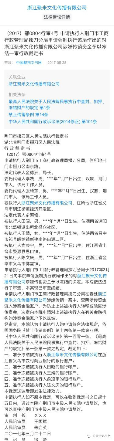 而更为严重的是,该公司在2017年就因为涉嫌传销资金,被湖北省荆门市掇刀区人民法院判决冻结公司以及公司主要人员的银行账户。