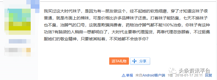事实上,已经有相当一部分消费者反应,大时代集团的防臭袜只是普通的棉袜,使用后没有任何效果,其价值与价格严重不符合。