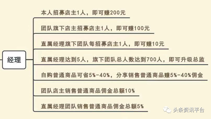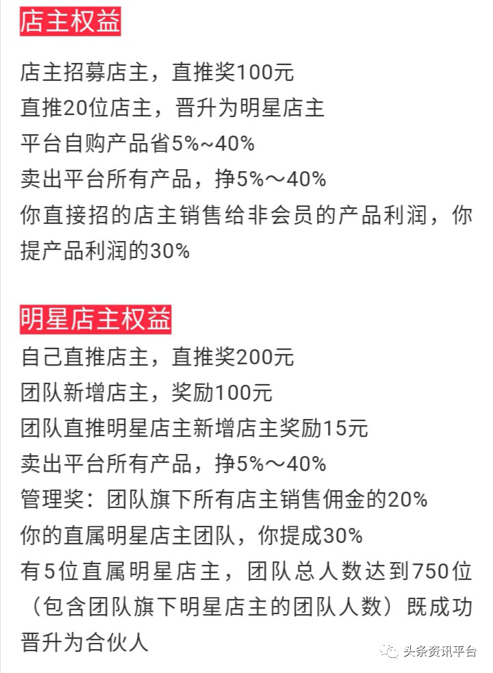 而当推广到20名店主销售后,即可晋升为明星店主,同时与自己推广所发展的店主组成一个团队。明星店主的新增的权益主要有五点,第一,个人推广奖励上升为二百元。第二,团队推广招募到新店主,明星店主同样可得到一百元的奖励。第三,团队新诞生明星店主后,可得十五元的奖励。第四,可得到团队旗下所有店主的销售佣金的20%。第五,可得到团队直属明星团队30%的提成。在明星店主旗下拥有五位直属明星店主且团队总人数达到750位时。还可以晋升为合伙人。