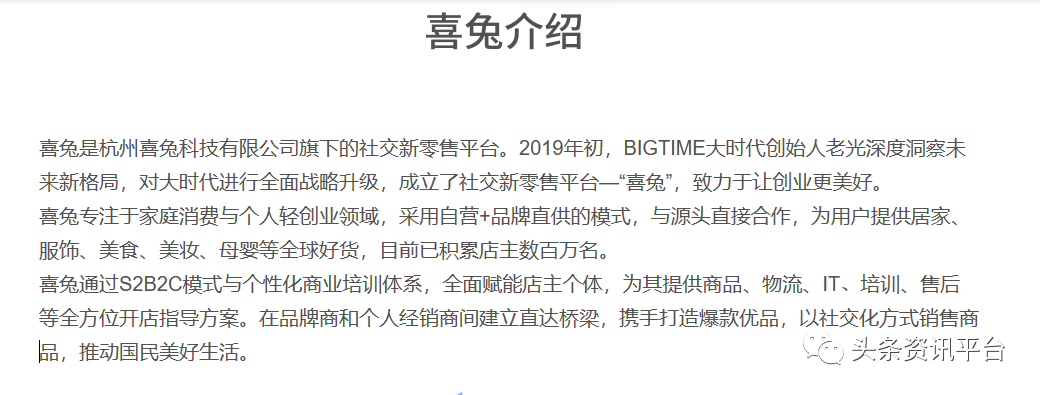 据调查,田昭在2019年4月创立了杭州喜兔科技有限公司,注册资本五千万元,实缴0元。喜兔的企业介绍里写道:喜兔是一家专注于家庭消费与个人轻创业领域,采用自营+品牌直供的模式,与源头直接合作,为用户提供居家、服饰、美食、美妆、母婴等全球好货,目前已积累店主数百万名。