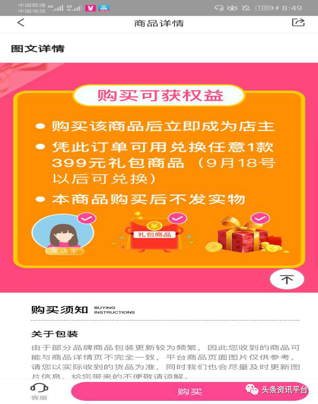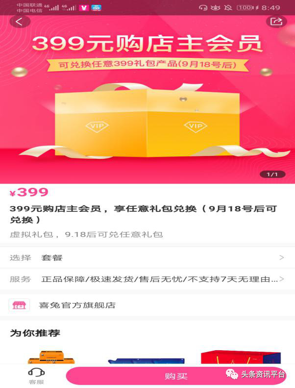 再来看看喜兔的店主制度。想要成为喜兔平台的店主,要在喜兔上购买一款标价为399元的产品。