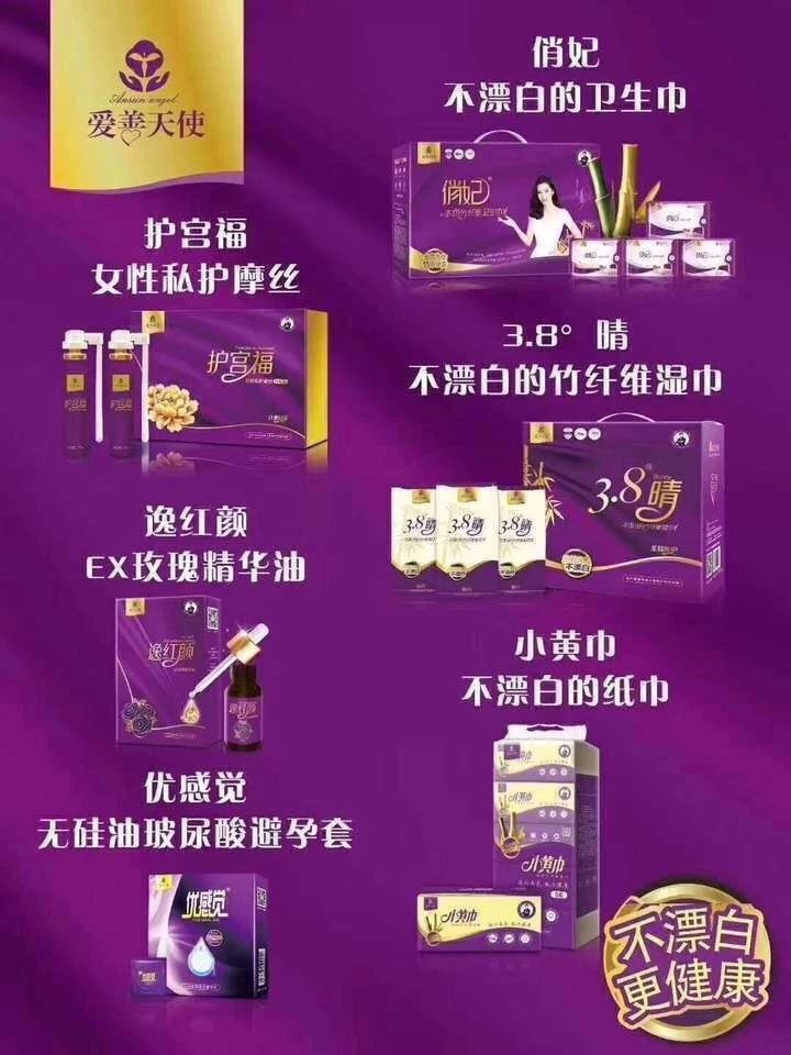爱善天使共有六大产品品类,包括:俏妃卫生巾、3.8°晴湿巾、护宫福女性私护摩斯、逸红颜EX玫瑰精华油、优感觉无硅油玻尿酸避孕套、小黄巾纸巾。无论你是哪一个级别,拿货都有一个前提,必须是爱善的内供商品,“王妃私护商城”里的非内供商品除外。