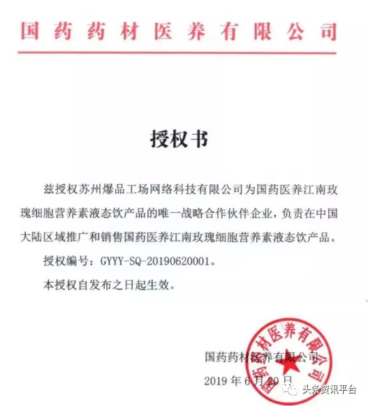 在该公司成立仅一周后,6月20日,成立于去年9月25日的国药药材医养有限公司就给了苏州爆品工场公司产品授权书。