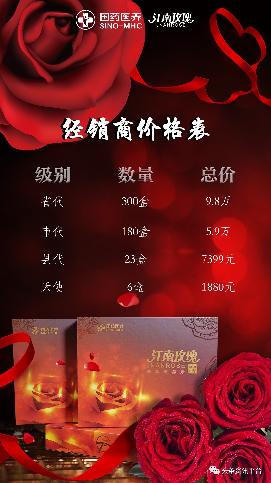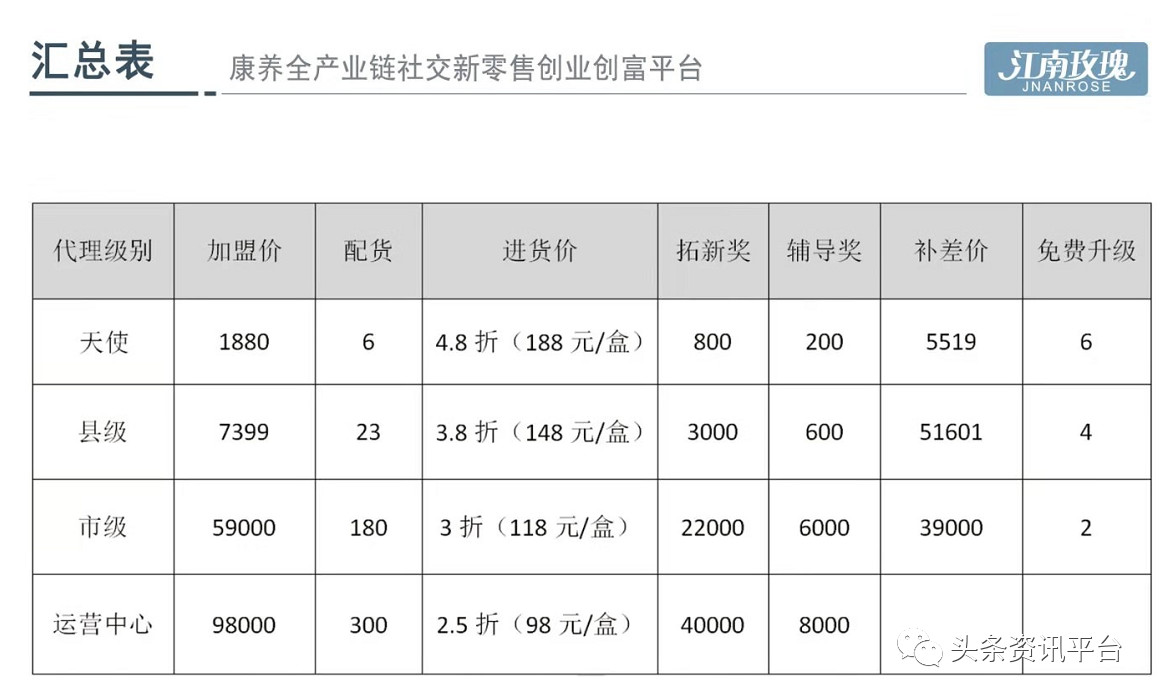 接下来,我们来看看在三商合一模式外衣下的江南玫瑰的代理制度。据悉,江南玫瑰细胞营养素的市场零售价是388元(规格为210ml:7袋×30ml),其代理级别共分为四种,分别是天使、县代、市代和省代(也有代理称之为运营中心)。