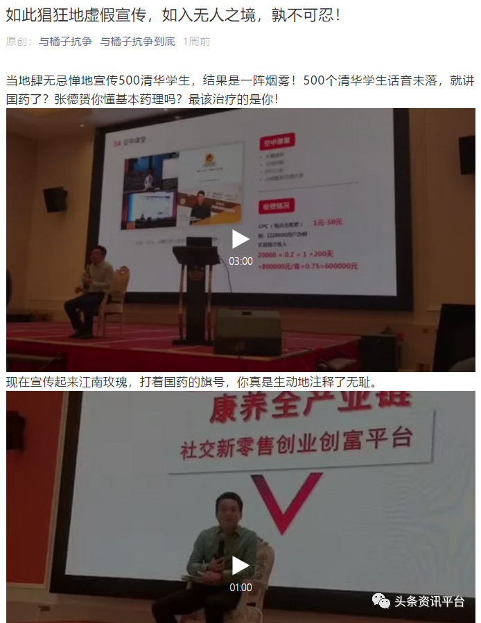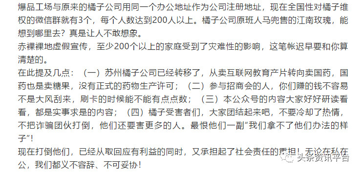 这段话出自负责帮助橘子公司受害者维权的微信公众号“与橘子抗争到底”,今年9月13日,该公众号以《如此猖狂地虚假宣传,如入无人之境,孰不可忍!》为题发表文章,文章内容直指江南玫瑰,作者表示橘子公司的实际控制人张德赟在为江南玫瑰站台时的讲话涉嫌虚假宣传。