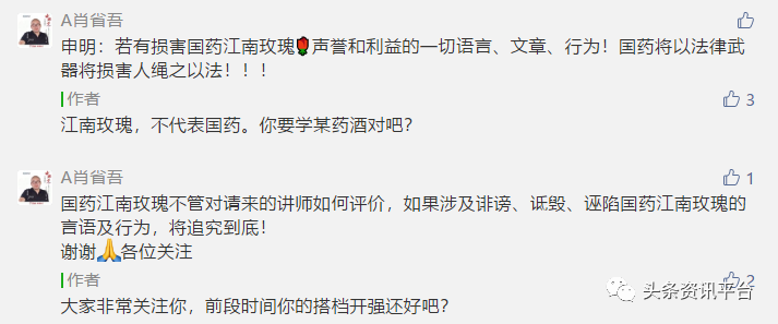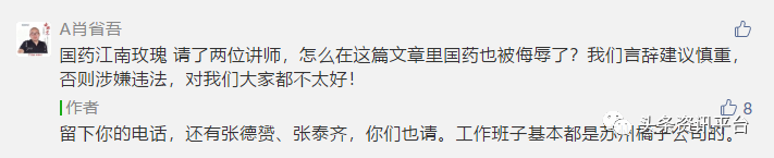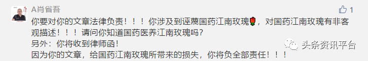 事实果真如此吗?对此,肖省吾并没有正面回应,而是义正言辞地表示“国药江南玫瑰不管对请来的讲师如何评价,如果涉及诽谤、诋毁、诬陷国药江南玫瑰的言语及行为,将追究到底!”此外,他还评论称,他已经请好了律师,准备向该公众号的作者发律师函。