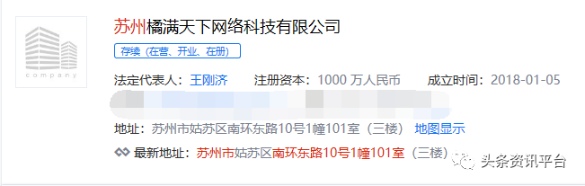 而橘满天下公司与橘子集团到底是什么关系呢?我们不妨从注册地址入手,经查,苏州橘满天下网络科技有限公司的注册地址和上文提到过的苏州爆品工场的注册地址完全一致。