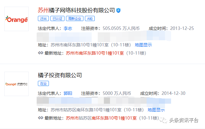 此外,我们还发现橘满天下公司是橘子投资有限公司的子公司,而橘子投资有限公司在几年前还曾是苏州橘子网络科技有限公司的子公司,而且这两家公司的注册地址也完全一致。由此可见,个中关系,不言自明。