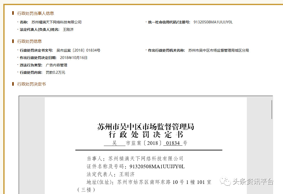 此外,这几家公司不但身陷代理投诉漩涡,还曾受到行政部门的处罚。2018年,橘满天下公司曾因广告内容管理问题被苏州市吴中区市场监督管理局城区分局处以行政处罚。