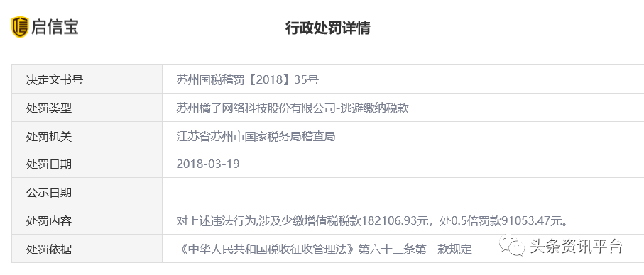 同样在这一年,苏州橘子网络科技股份有限公司因逃避缴纳税款,遭到了江苏省苏州市国家税务局稽查局的处罚:涉及少缴增值税税款182106.93元,处0.5倍罚款91053.47元。