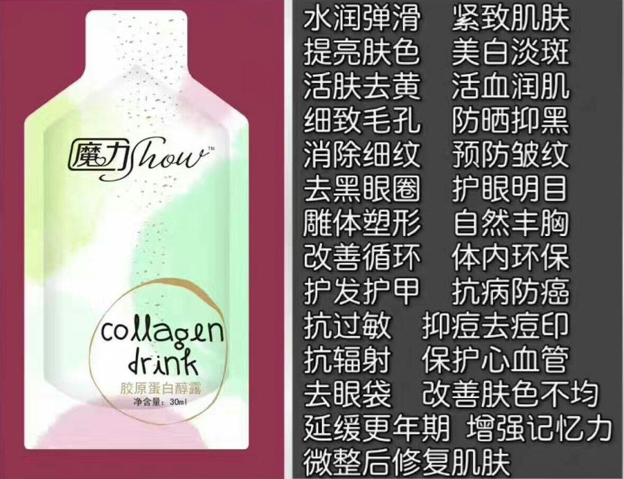 2017年4月,魔力show第三款产品巨水光胶原蛋白醇露上市。经销商把这款胶原蛋白产品形容为可以喝的“水光针”。据悉,水光针是一种注射类的护肤疗法,注射时要借助专门的仪器“水光枪”,将需要的美容针剂注射到紧贴表皮下的真皮层,注射后能让皮肤变得水润,光亮而得名。