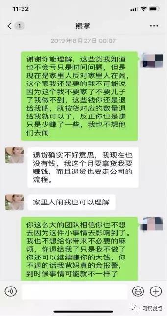 于是,张萌的家人建议她赶紧跟上线要求退货,但是熊掌说是新闻夸大了事实,坚决不退货。如果要退走必须走公司流程,只能拿百分之七十的退货款,张萌对此非常愤怒。