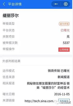 截止2019年9月25日,缇丽莎尔已被微信小程序“腾讯灵鲲金融风险查询举报中心”标记为“已曝光的疑为传销组织”,被举报次数多达5337次。