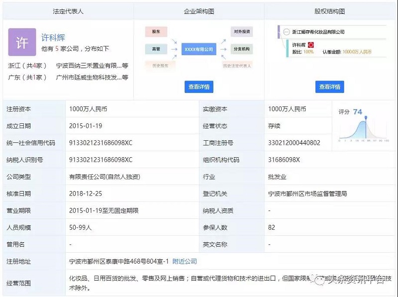 据悉,姬存希属于国产品牌,是浙江姬存希化妆品有限公司——百纳生元旗下品牌之一,创始人兼董事长许科辉,公司于2015年1月19日成立,注册资本1000万。