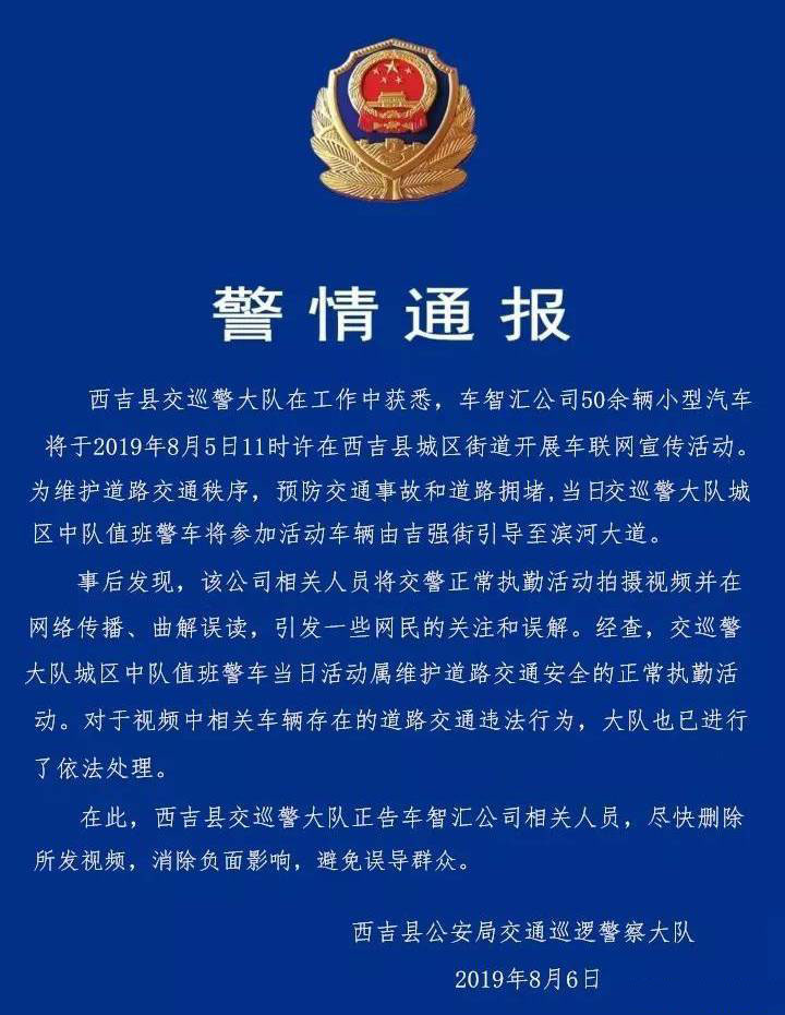 8月6日,西吉县公安局交通巡逻警察大队就此事也发布了警情通报。该警情通报称,西吉县交巡警大队在工作中获悉,车智汇公司50余辆小型汽车将于2019年8月5日11时许在西吉县城区街道开展车联网宣传活动。为维护道路交通秩序,预防交通事故和道路拥堵,当日交巡警大队城区中队值班警车将参加活动车辆由吉强街引导至滨河大道。
