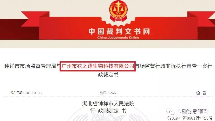 8月9日,广州市花之语生物科技有限公司(以下简称:广州花之语公司)因涉嫌传销,其公司在金融机构和第三方支付平台的账户资金被湖北省钟祥市人民法院冻结。
