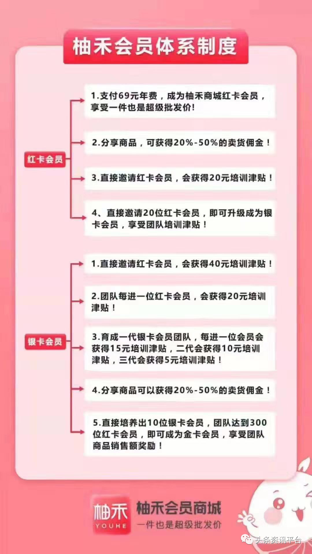 柚禾商城将会员分为三个等级,分别是红卡会员、银卡会员、金卡会员。消费者支付69元年费,即可成为红卡会员。成为红卡会员后,分享商品会获得20%至50%的卖货佣金,并且直接推荐红卡会员,会获得20元培训津贴。