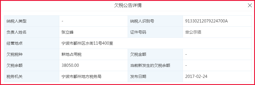 据天眼查资料显示,许科辉旗下共有五家公司,其中一家宁波百纳三禾置业有限公司曾被记载在欠税名单中。