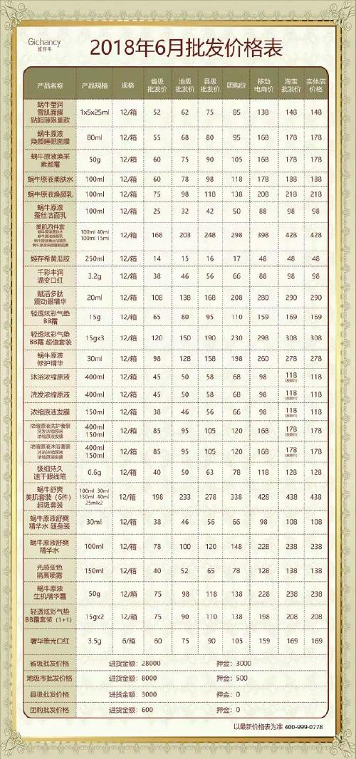 拿货价格因不同的代理级别而异,同时,还存在移动电商价、淘宝批发价、实体店价格,其中淘宝批发价与实体店价格相同。具体的价格表如下: