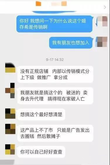 除此之外,据知情人士透露,姬存希没有正规店铺,内部以传销模式分上下级,产品上不了市,只能通过广告去圈钱,身边的朋友就是因为姬存希代理被害的家破人亡等。