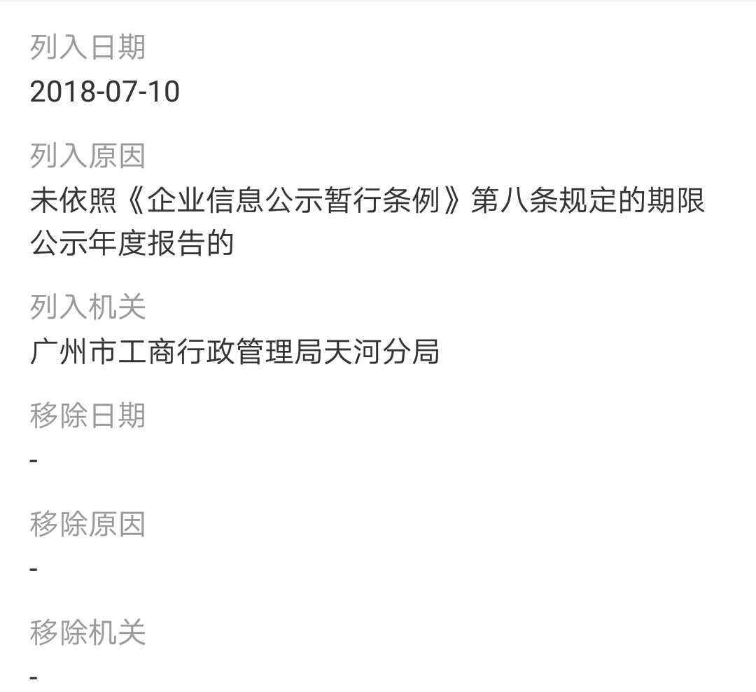 并且由许科辉担任股东的广州市廷威生物科技发展有限公司也曾因未依照规定期限公示年度报告而被列入企业经营异常名单。