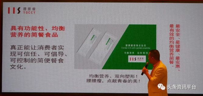 在去年举行的“亿万演销,赚钱真相”无锡站上,通过下图中的PPT,我们可以清楚地看到腰腰瘦的产品被介绍为“最安全、最健康、最实惠、最有效的均衡营养简餐”。