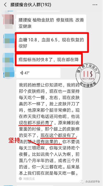 在腰腰瘦合伙人群、腰腰瘦财富裂变1群等微信群中,更是有使用者表明腰腰瘦的产品对“皮肤癌”等病症的治疗有效果。