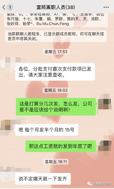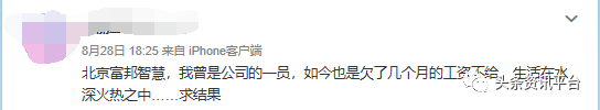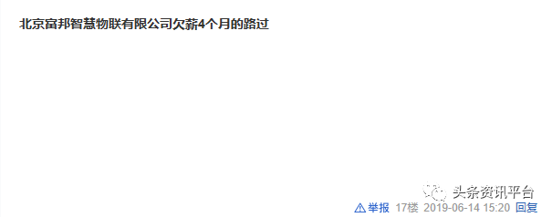 原富邦智慧的员工B则通过简书记录了自己的讨薪经过,“事情发生在2018年11月15号,公司以年底清算为由,说推迟工资一个星期。一个星期后,等来的当然是食言。公司100多个员工,欠薪四个月,大家被陆陆续续裁员,还有坚持不住看不到希望的自动离职的。过年回来,开了一次动员大会,从来不露面的大佬来了,给大家声情并茂地开了一个会,说2019年3月15号是打假日,他肯定把钱连本带利地给大家。大家都还真有点相信了。等到了3月15号,当然还是没有钱。”此后这位员工联合其他员工在北京海淀区申请了法律援助律师,以寻求帮助。