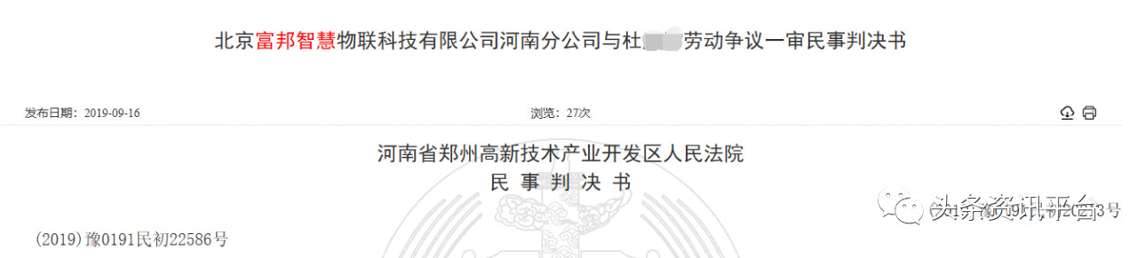 经查中国裁判文书网,我们发现富邦智慧欠薪事件确有其实。据河南省郑州高新技术产业开发区人民法院公示的一份民事判决书披露,该公司的河南分公司(法定代表人依然是裴健)因拖欠员工工资,被原员工杜某某告上法庭。本案中,富邦公司未足额向杜某某发放2018年11月至2019年3月18日的工资,因而杜某某有权要求富邦公司继续支付剩余工资,法院最终判处北京富邦智慧物联科技有限公司河南分公司向杜某某支付工资2.7万余元、经济补偿金1万元和差旅费1.4万余元,共计5.2万余元。