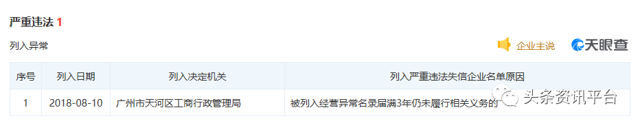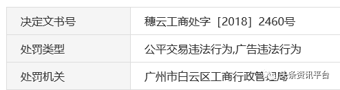 2019年3月28日,该公司因通过登记的住所或者经营场所无法联系被广州市工商行政管理局白云分局列入经营异常名录;而在半年多前的2018年8月1日,该公司还因公平交易违法行为、广告违法行为被广州市白云区工商行政管理局处以行政处罚22万元。