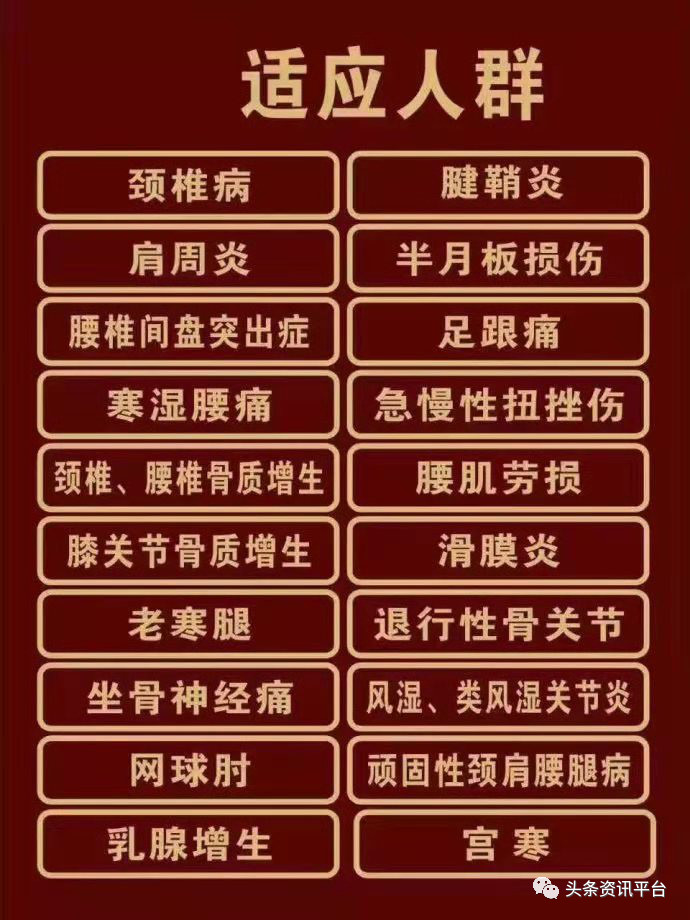 据宣传材料介绍,该产品还对老寒腿、宫寒、乳腺增生、头疼、促进新陈代谢、血液循环、防止腰椎疼痛、肌肉拉伤、落枕、肩周炎、关节炎、疲劳过度、脊椎病等多种症状具有相应功效。