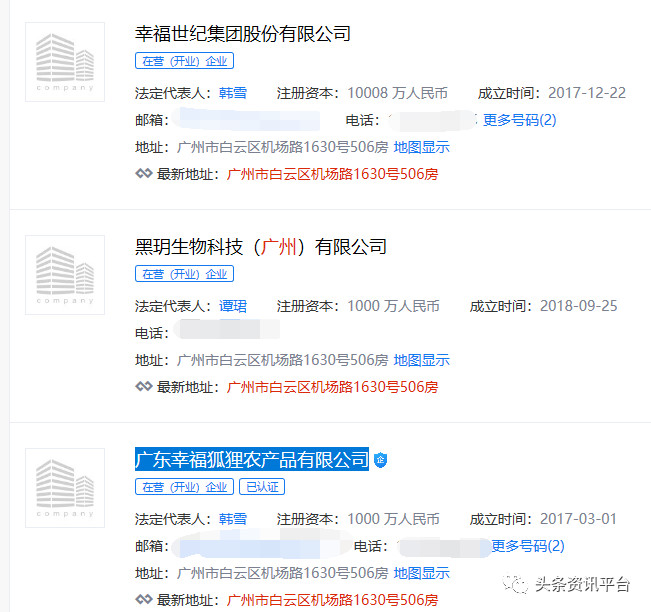 另外值得一提的是,黑玥生物科技(广州)有限公司的注册地址为广州市白云区机场路1630号506房,与该公司共同使用该注册地址的还有幸福世纪集团股份有限公司、广东幸福狐狸农产品有限公司等公司,不仅如此,这几家公司的联系电话甚至都是一个号码。此外,幸福世纪集团股份有限公司所备案的企业邮箱的主人也正是一个QQ昵称为“佳鑫陈基歌”的用户。