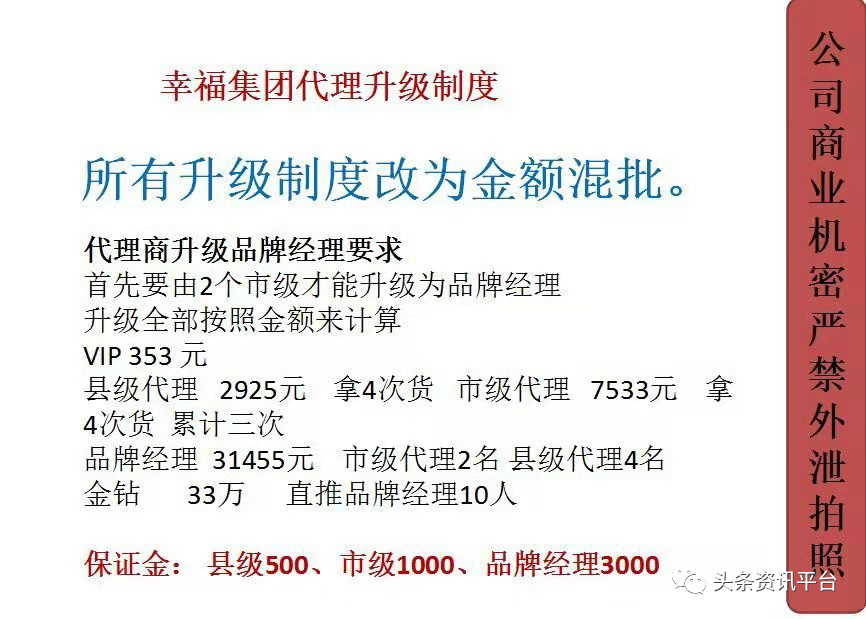 在对外的制度宣传上,代理商们往往拿出的是四级代理的制度表,实际上,幸福狐狸的代理级别不止这些,据代理商小吴介绍,在经理往上的级别还有金钻和总裁、分公司(这些级别的代理在公司上市后将有股权分成)。不过金钻不是一开始就能上的,要有团队了、培养了经理才能上金钻。
