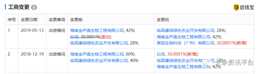 在2018年12月到2019年5月期间,幸福狐狸集团副总裁白龙还曾在荟生(海南)健康产业有限公司担任过股东,今年5月13日,白龙退出的同时黑玥生物科技(广州)有限公司加入(投资占比百分之三十)。