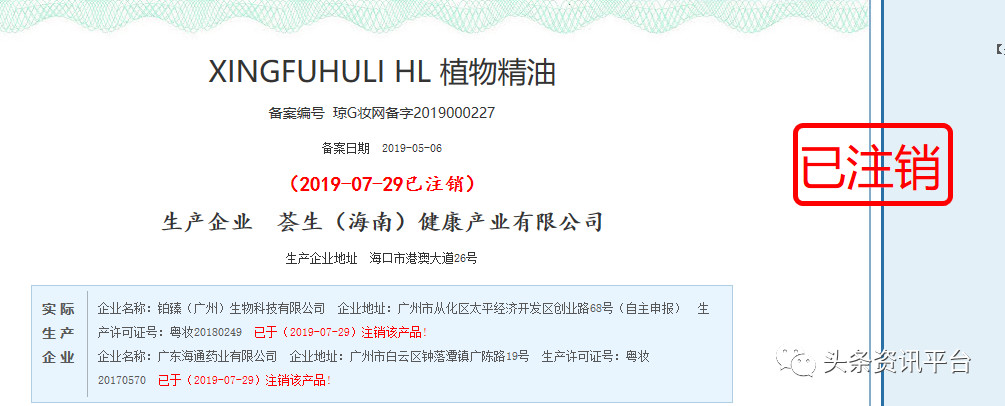 另外一款同名产品(备案编号为琼G妆网备字2019000227)已于今年7月29日注销。