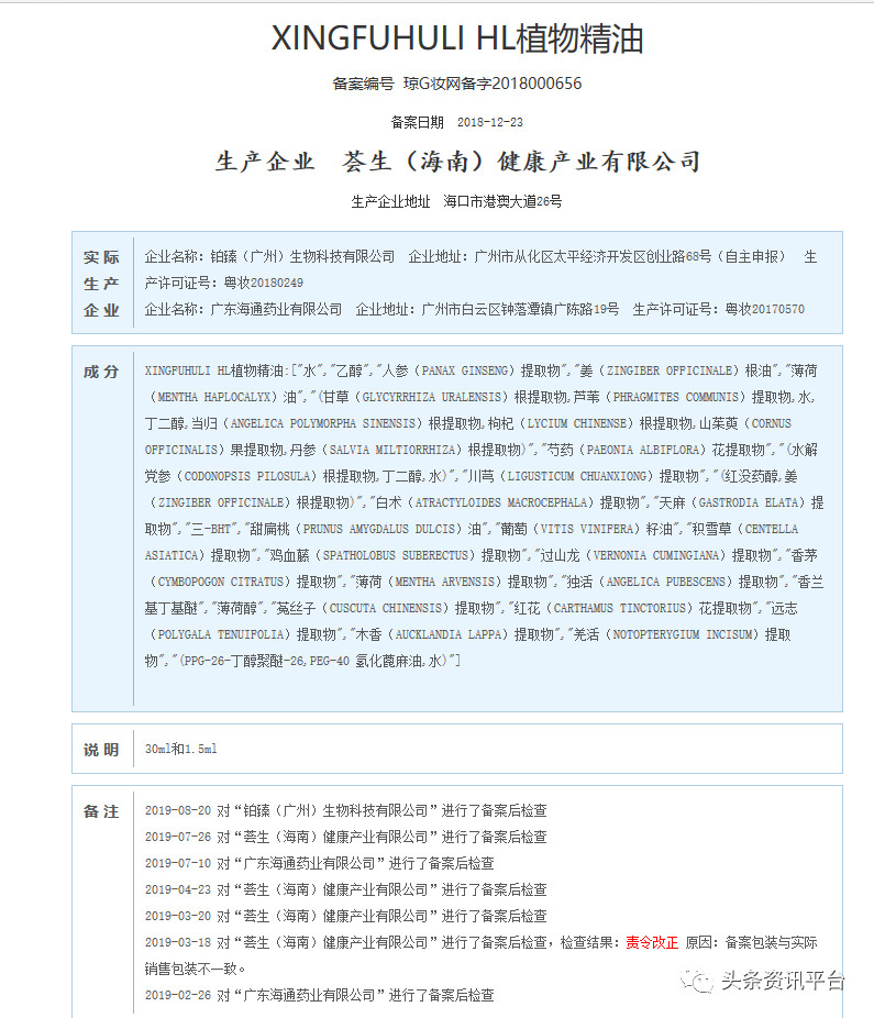 经查,“XINGFUHULI HL植物精油”的备案编号是“琼G妆网备字2018000656”,生产企业为荟生(海南)健康产业有限公司,实际生产企业的名称则有两个,分别是铂臻(广州)生物科技有限公司和广东海通药业有限公司。2019年3月18日,有关部门对“荟生(海南)健康产业有限公司”进行了备案后检查,检查结果为责令改正,原因为备案包装与实际销售包装不一致。