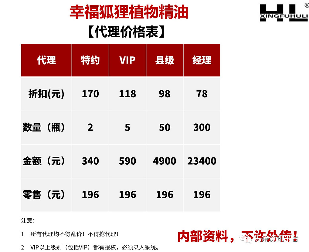 接下来,我们来看看该款精油的销售价格,零售的话,1瓶起,每瓶196元;特约的话,2瓶起,170元一瓶;VIP则是5瓶起,118元一瓶;县级则是50瓶起,98元一瓶;经理则是300瓶起,78元一瓶。