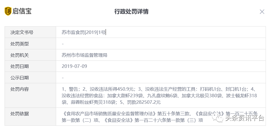 据启信宝显示,2019年7月9日,该公司被苏州市市场监督管理局以《食用农产品市场销售质量安全监督管理办法》和《食品安全法》为法律依据,处以五项行政处罚:1、警告;2、没收违法所得450.9元;3、没收违法生产经营的工具:打码机1台、封口机1台;4、没收违法经营的食品:加拿大甜虾239袋、九孔盘纹鲍6袋、加拿大北极贝380袋、波士顿龙虾318袋、蒜蓉粉丝虾夷贝318袋;5、罚款282507.2元。