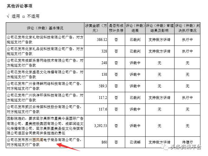 2018年8月21日,西风阁蟹太太与分众传媒集团在上海对双方达成的战略合作协议进行了签约仪式。一年后,在分众传媒于今年8月22日发布的报告中,我们也看到了西风阁公司的身影,在“其他诉讼事项”板块中,有“公司已发布苏州西风阁电子商务有限公司广告, 对方拖延支付广告款”的字样,涉案金额860万元,诉讼(仲裁)进展为“已调解”,诉讼(仲裁)判决执行情况为“待履行”。